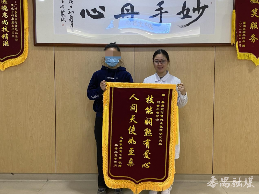 近日,番禺区何贤纪念医院消化病区护士站悬挂起一面特殊的锦旗,红底金字的“技能娴熟有爱心 人间天使如至亲”格外醒目。这面由肝癌晚期患者黄先生家属送来的锦旗,见证了该院消化病区主管护师刘弯与患者之间超越普通医患关系的深情厚谊。