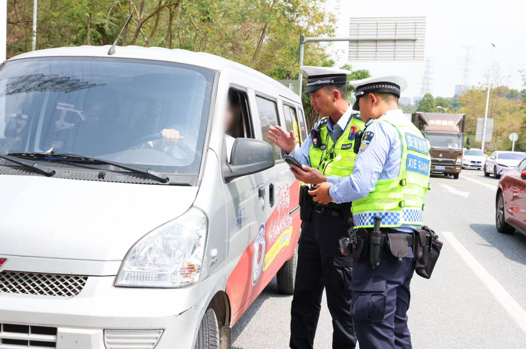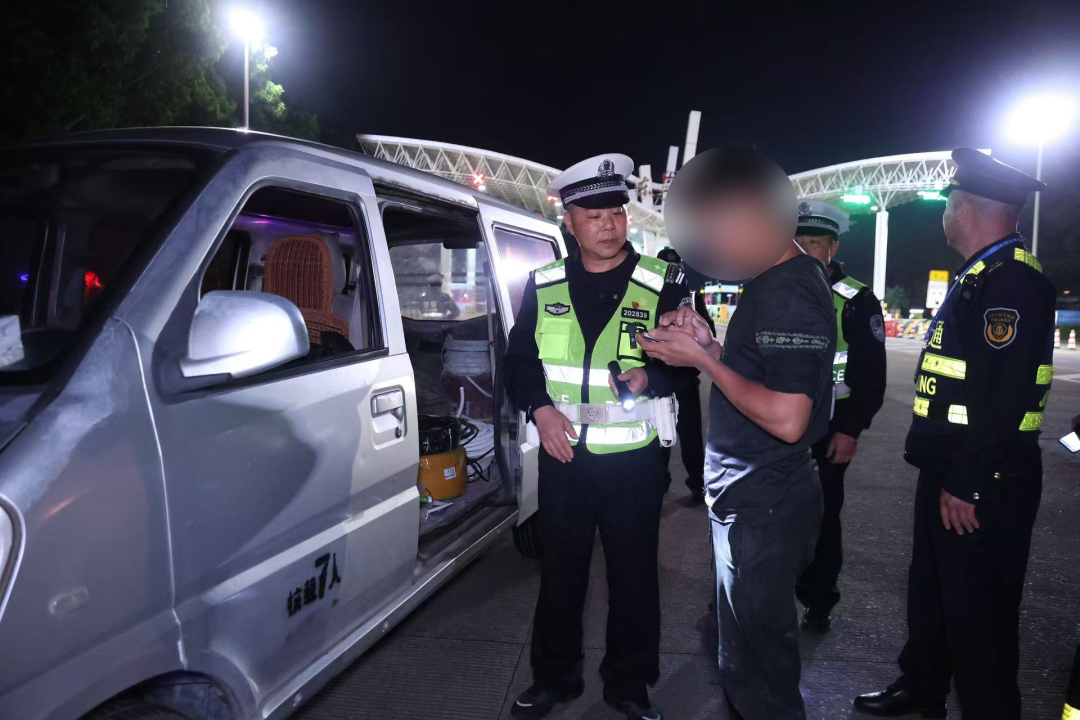 2025年4月12日4时30分,广州交警在绕城高速石湖站入口现场拦截一辆超员且涉嫌非法营运面包车。