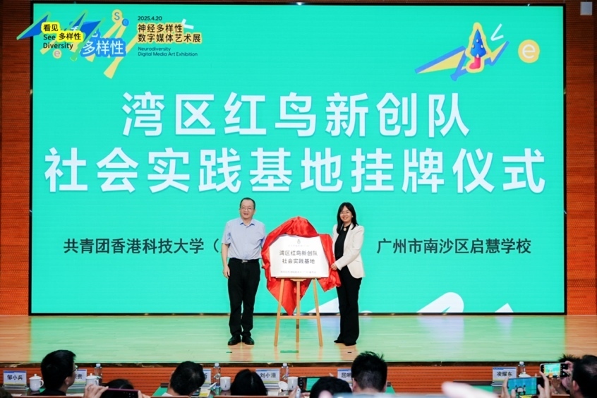 共青团香港科技大学(广州)委员会湾区红鸟新创队社会实践基地与广州市南沙区启慧学校举行了授牌仪式,标志着双方将在大学生实习实践、融合教育、艺术疗愈、研究等方面展开更深入合作,共同探索科技与人文关怀的结合路径。