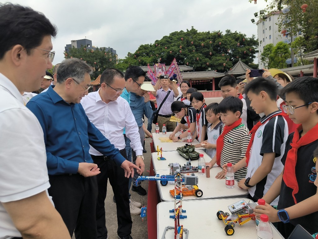 项目启动仪式后,参加活动的领导嘉宾们观摩了上佳市小学科创展示体验活动,对孩子们制作的动力风车、起重机、巡迹小车等科创作品非常感兴趣,对孩子编写的程序与现场搭建的积木,协调一致的操作展示表示赞赏。
