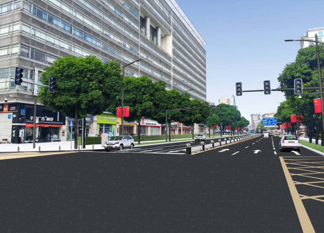 其中,莞太路-石竹路段约1.12km段,开展慢行道、街区U型空间改造以及机动车道加铺改造;石竹路-簪花路约0.38km段,在前期慢行道改造完毕的基础上,完成机动车道加铺改造。