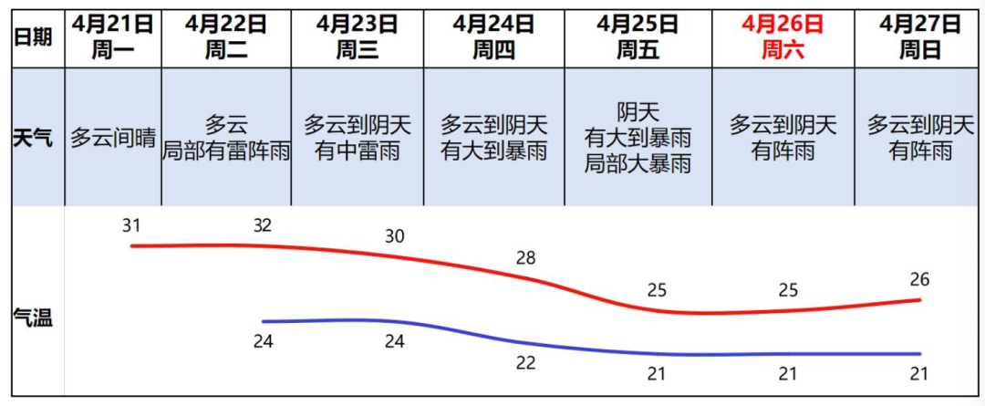 21日至22日,多云为主,局部有雷阵雨,湿度增加;