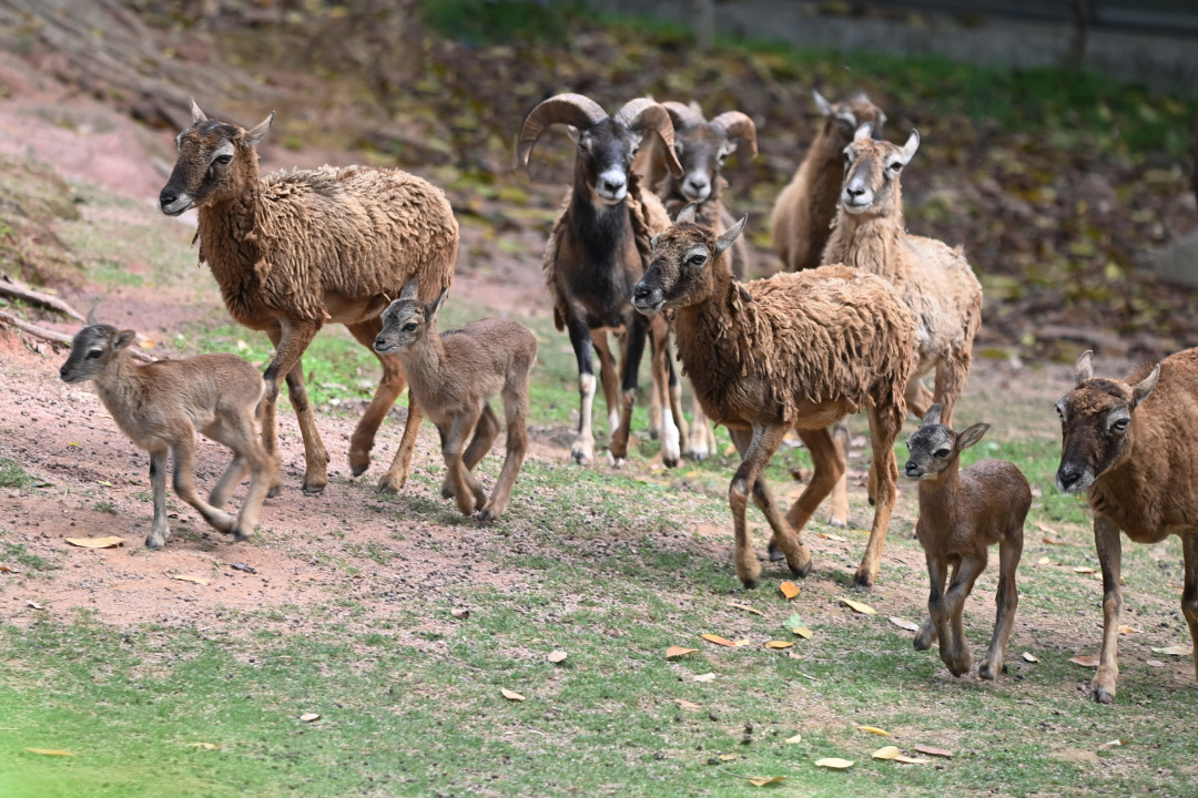 4月21日,深圳野生动物园摩弗伦羊区,3只摩弗伦羊幼崽各灵活地跑动撒欢,个个机灵活泼,萌态十足,各只母羊分别跟随着自己的羊宝宝,其家族成员也陪伴左右,其乐融融。