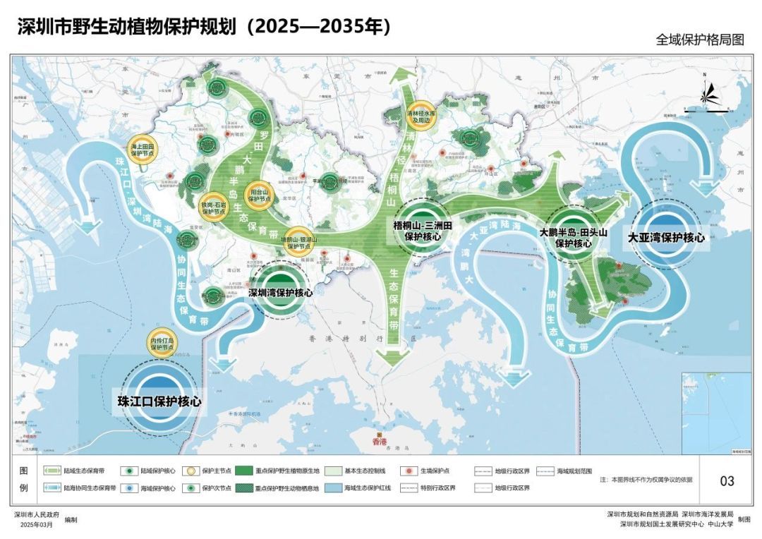 构建“四带五核多节点”野生动植物保护格局。包括罗田-大鹏、清林径-梧桐山生态保育带,珠江口-深圳湾、大鹏湾-大亚湾陆海协同生态保育带;以及大鹏半岛-田头山保护核心、珠江口保护核心、梧桐山-三洲田、深圳湾、大亚湾等五大保护核心。突出穿山甲、黑脸琵鹭、中华白海豚等伞护种旗舰种栖息生境的整体保护,兼顾其他重点保护物种、特色(有)物种的生境系统性保护,推动栖息地保护向生息网构建转变,形成山海城全域生境网络。
