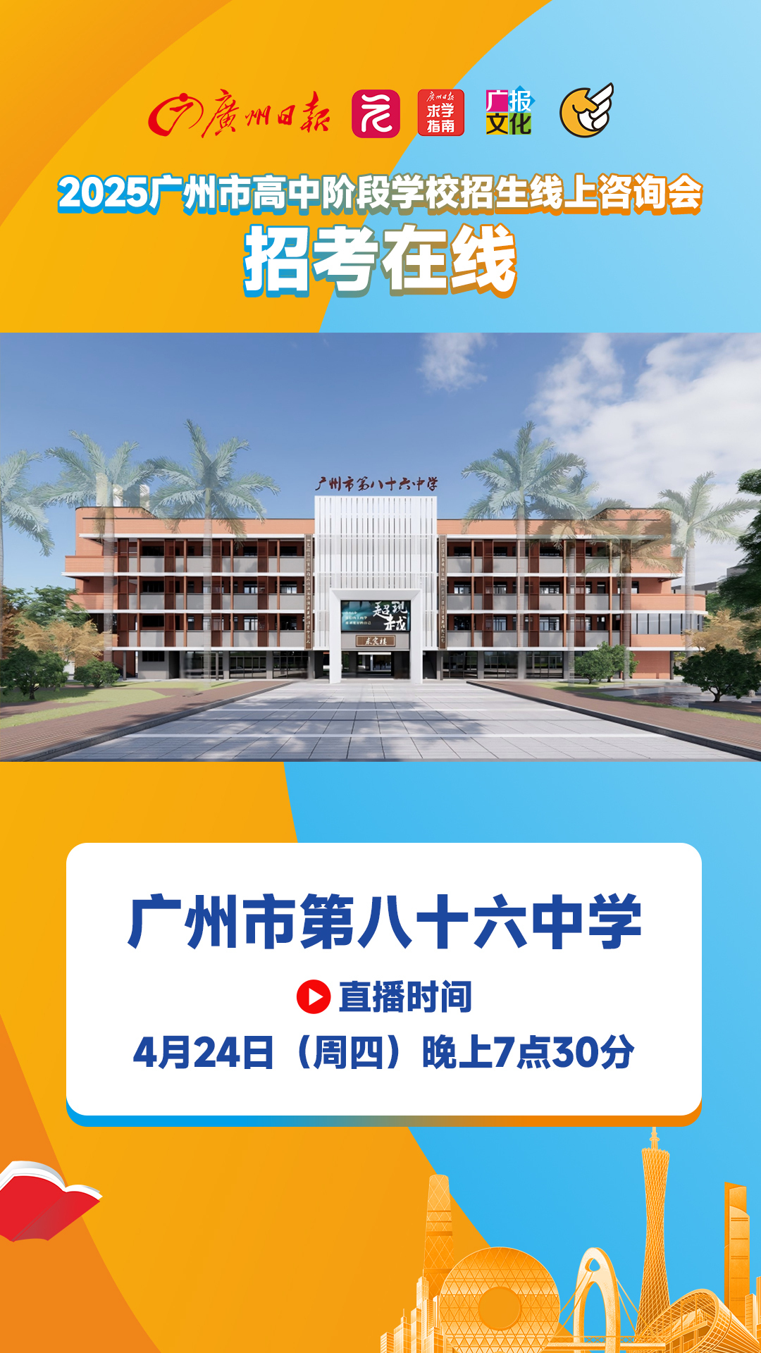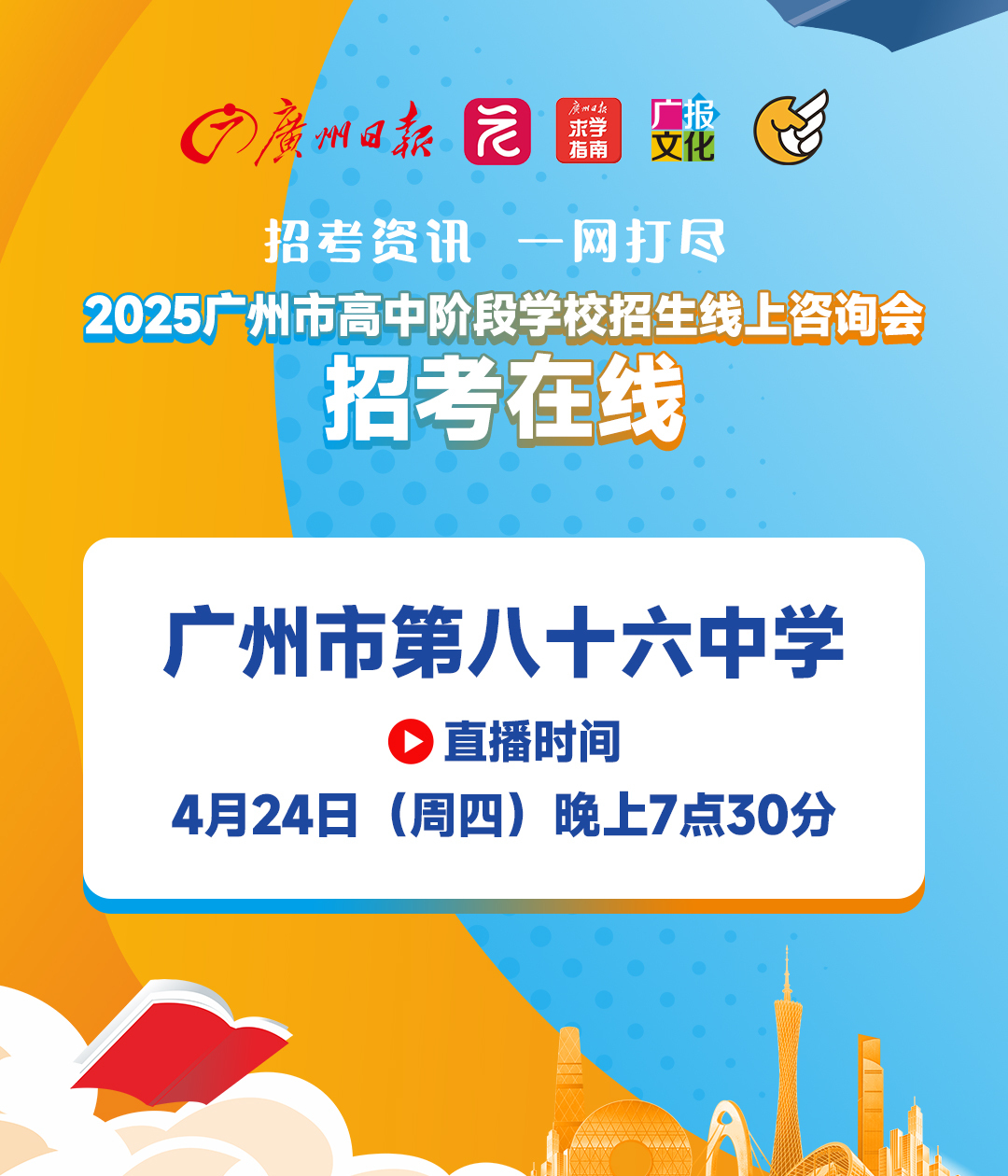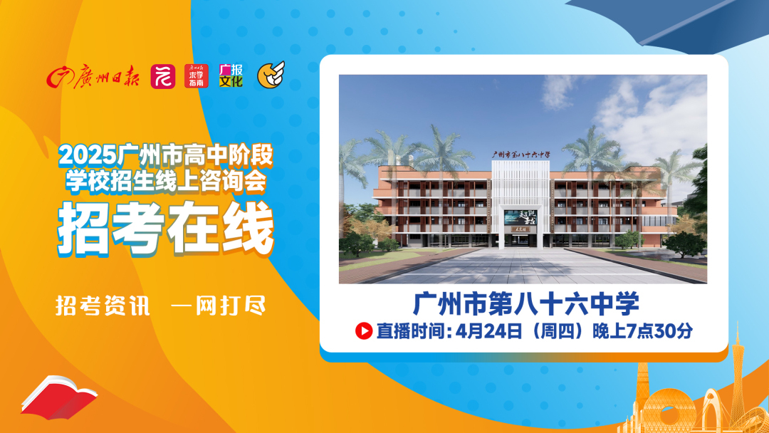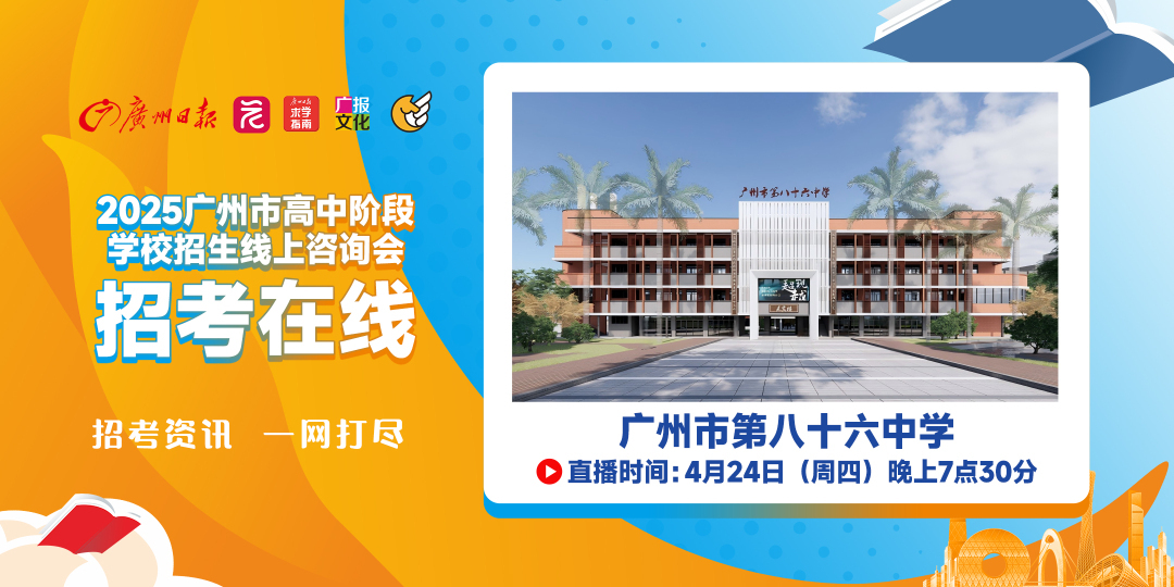 广报求学“招考在线”广州市第八十六中学专场来了!4月24日晚7:30,广报求学邀请广州市第八十六中学贺老师,做客“招考在线”直播间,介绍86中今年的高中招生信息,解答热点问题。 考生如何在志愿填报过程中“避坑”?对有意填报86中的考生,学校有何填报建议?86中的教学、管理、校园环境、食宿条件是怎样的?锁定广报求学“招考在线”,4月24日晚7:30约定你!