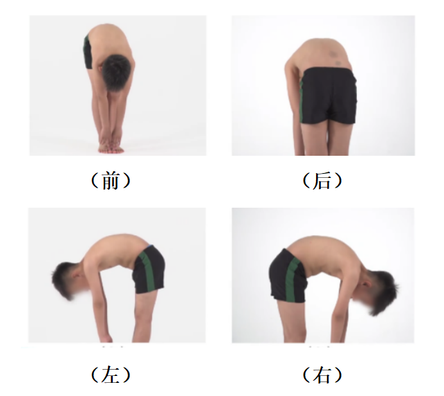第二步:直腿弯腰至90度,家长双目平视背部,从前、后、左、右四个方位观察。