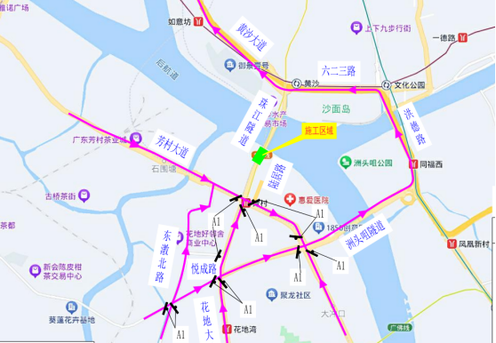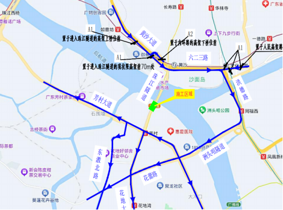 过往车辆可选择绕道通行,北行车辆绕道芳村大道—洲头咀隧道—洪德路—六二三路通行,南行车辆绕道六二三路—洪德路—洲头咀隧道—花蕾路通行。交通疏导图如下: