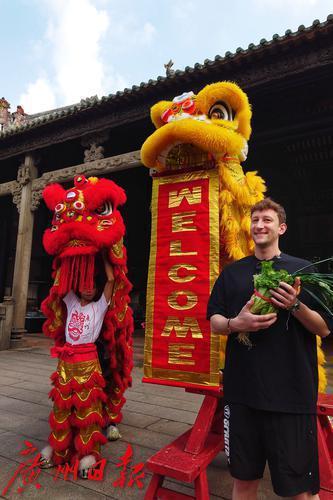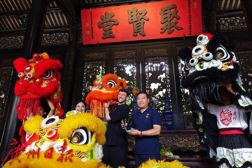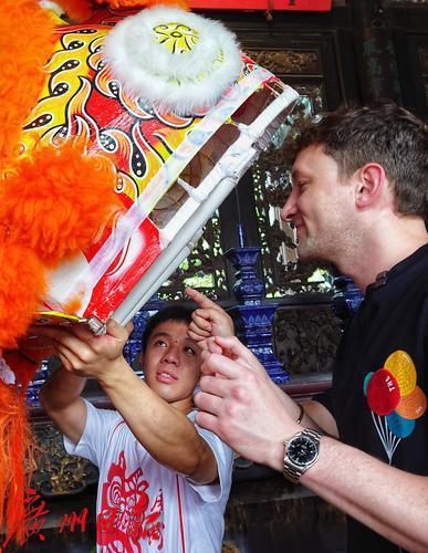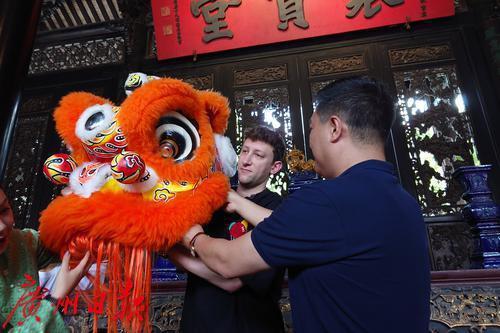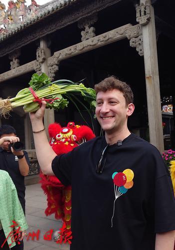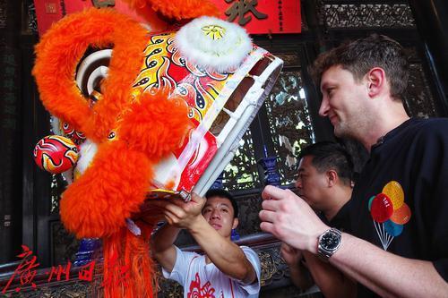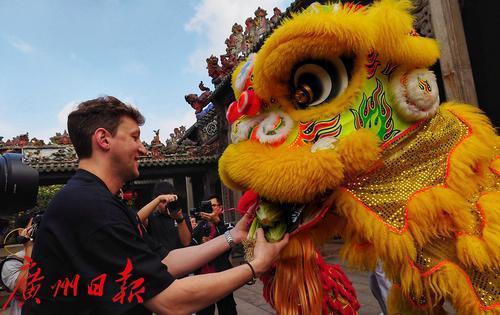 灵动威武的舞狮技艺展现了广府民俗的活力,埃文接过代表好运的醒狮采青。
