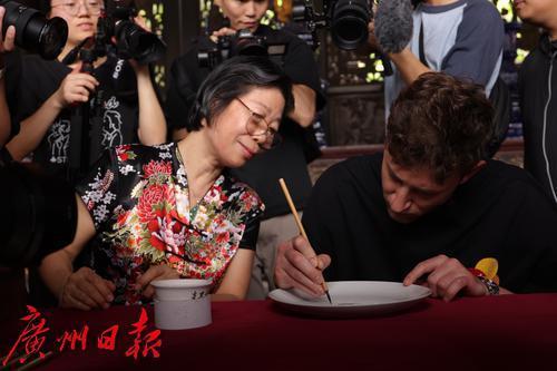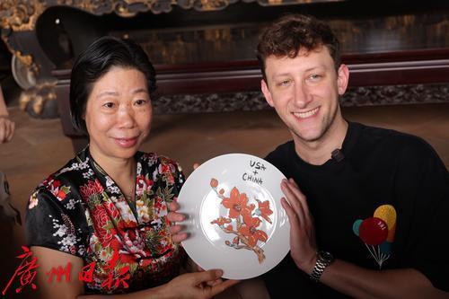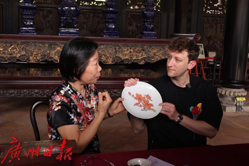 埃文在广彩广东省级传承人何丽芬老师的指导下,上手体验图稿设计、描线、涂色等工序,亲身体验广彩绘制,勾勒出广州市花木棉花,将现代与传统工艺相交融,近距离感受非遗的温度。