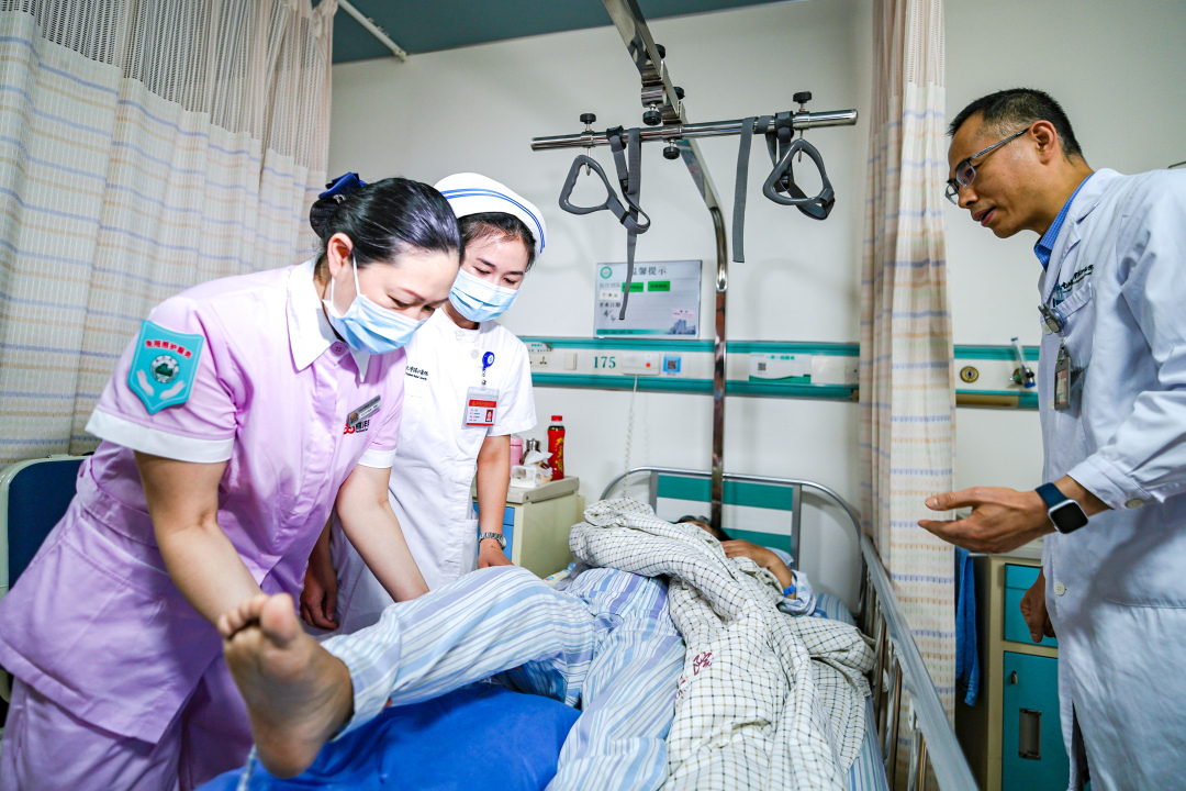 “这是膝关节置换术后患者,康复锻炼要跟上,平时腿部抬高训练要这样做……”,在珠江医院创伤骨科免陪护病房,医生、护士查房,指导医疗护理员杨丽熟练地帮助患者王阿姨(化名)做康复锻炼。