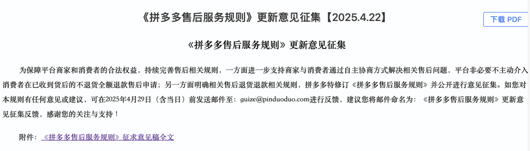当晚,拼多多公布《拼多多售后服务规则》更新意见征集。平台称,为保障平台商家和消费者的合法权益,持续完善售后相关规则,一方面进一步支持商家与消费者通过自主协商方式解决相关售后问题,平台非必要不主动介入消费者在已收到货后的不退货全额退款售后申请;另一方面明确相关售后退货退款相关规则,拼多多特修订《拼多多售后服务规则》并公开进行意见征集。
