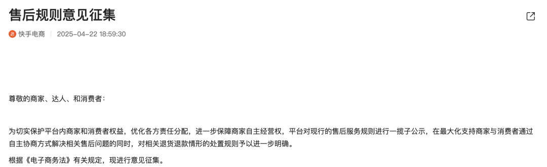 快手电商也发布了《售后规则意见征集》,快手电商称,为切实保护平台内商家和消费者权益,优化各方责任分配,进一步保障商家自主经营权,平台对现行的售后服务规则进行一揽子公示,在最大化支持商家与消费者通过自主协商方式解决相关售后问题的同时,对相关退货退款情形的处置规则予以进一步明确。根据《电子商务法》有关规定,现进行意见征集。