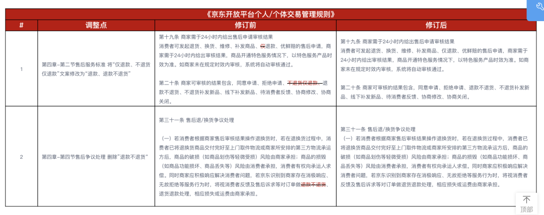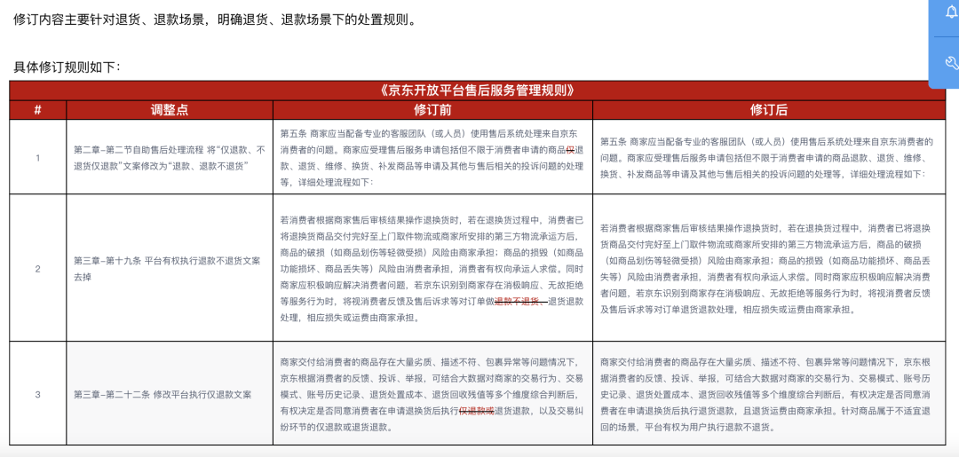 4月22日晚间,记者留意到,多家电商平台陆续对“仅退款”规则进行重大调整或征集意见。据悉,京东发布拟对《京东开放平台售后服务管理规则》及相关规则进行修订,修订公示期为4月22日至4月29日,规则预计于2025年4月30日生效,修订内容主要针对退货、退款场景,明确退货、退款场景下的处置规则。