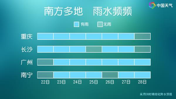 连续降雨之下,江南南部、华南北部部分地区降雨量将较常年同期偏多2至6成,局地偏多1倍以上,累计雨量可达100毫米以上,局地200毫米左右。大城市中,广州、重庆等地或雨水天天见,未来一周有6至7天都会有雨。