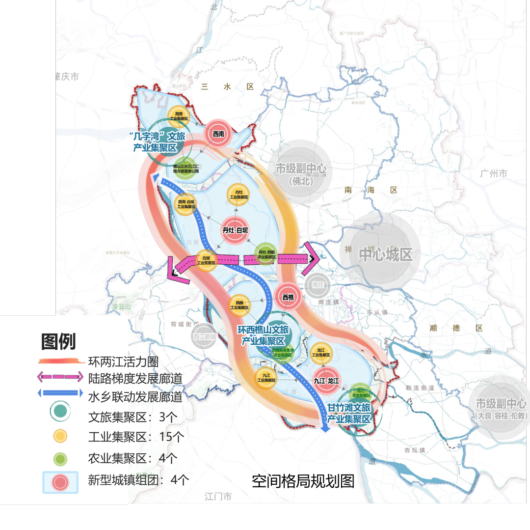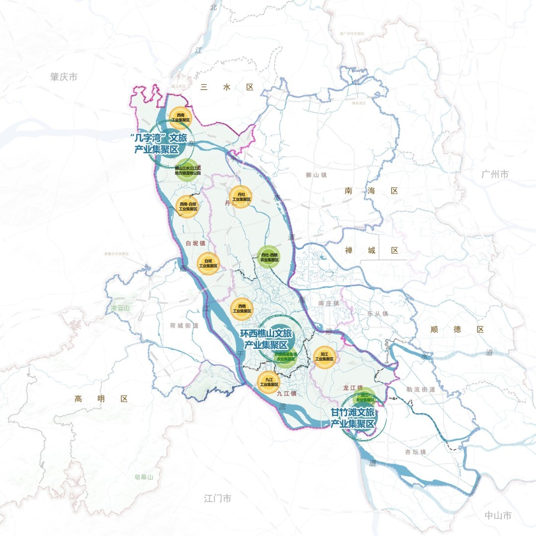 据悉,先行区的范围由核心区、协同区两部分构成。其中,核心区涵盖丹灶、西樵、九江、龙江、白坭、西南6个镇街,重点建设北至思贤滘、南至甘竹溪、东至北江、西至西江的核心区域,聚焦产业升级、生态保护与城乡融合的深度实践;协同区包括西江、北江沿线的狮山、南庄、乐从、勒流、杏坛、荷城6个镇街,围绕设施互通、产业协同、文旅融合、风貌提升四大领域,与核心区形成功能互补、要素流动的发展共同体。