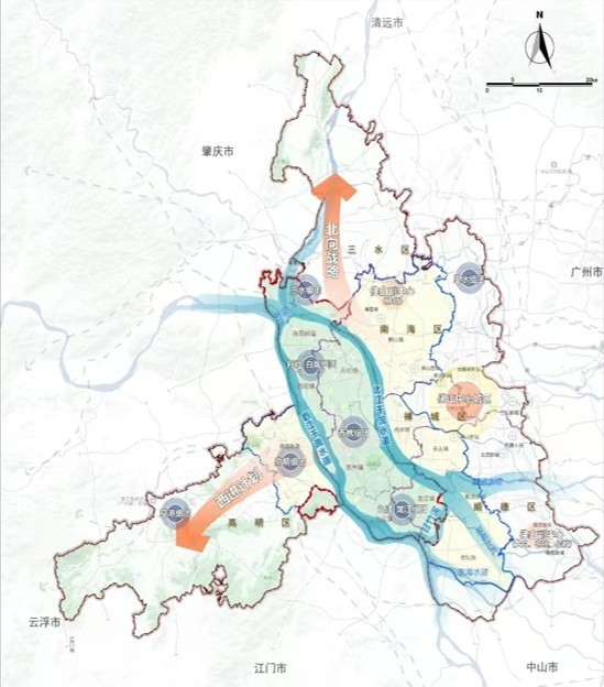 “2”指构建2条发展廊道。承东启西的陆路梯度发展廊道以季华路及其西延线为主轴,全长约35公里,串联南海、禅城、三水三区,并通过富龙西江特大桥连接高明区,促进东西部区域协同发展;贯通南北的水乡联动发展廊道全长约90公里,自北向南串联三水、南海、顺德三区,依托樵北涌、官山涌等水系,激活水乡资源,推动区域联动发展。