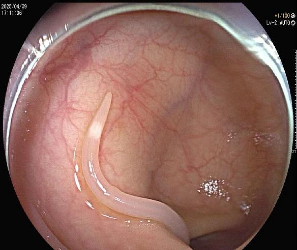 金女士(化名)近半年来反复出现下腹绞痛,自行服用药物后未见缓解。到广州中医药大学深圳医院内分泌科门诊就诊,接诊医师刘畅在细致问诊和体格检查后,初步排除了肠胃炎等常见病因,果断为她安排了胃肠镜检查。经脾胃病科医师刘乐鑫肠镜检查,发现她的肠道内竟然有一条白色细长的“小虫子”在慢慢蠕动,原来是一条活体寄生虫,医师果断通过肠镜用活检钳夹住蛔虫,慢慢将它从肠道里拖了出来。经检测,该寄生虫为蛔虫,食用被虫卵感染后的食物有可能导致肚子里长蛔虫。