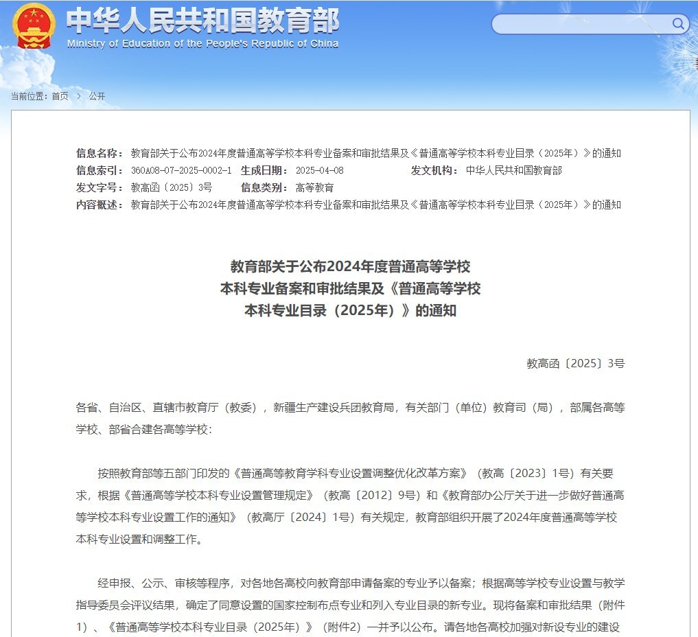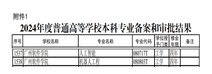日前,教育部公布2024年度普通高等学校本科专业备案和审批结果及《普通高等学校本科专业目录(2025年)》,对各地各高校向教育部申请备案的专业予以备案;根据高等学校专业设置与教学指导委员会评议结果,确定了同意设置的国家控制布点专业和列入专业目录的新专业。广州软件学院申报的“人工智能(专业代码:080717T)”“机器人工程(专业代码:080803T)”2个新专业顺利通过教育部批准备案,纳入2025年高考招生。