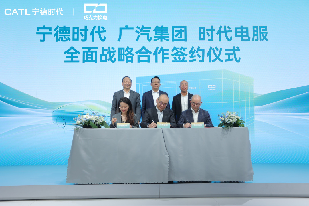 4月23日,第21届上海国际汽车工业展览会期间,宁德时代举办“巧克力换电”新车型发布仪式。活动现场,宁德时代与广汽集团签署全面战略合作协议。广汽集团作为首家与“巧克力换电”全生态合作的车企,将在更多旗下车型引入“巧克力”标准,并在换电站建设、电池银行业务、换电车型营销推广及退役电池梯次利用等多领域与宁德时代展开全面合作。