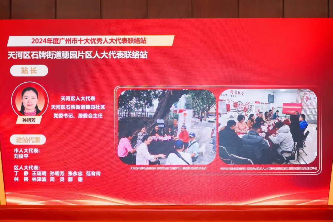 4月23日下午,广州市人大常委会召开广州人大2024年度代表工作优秀案例发布会,公布十大优秀人大代表联络站(2024年度)。其中,从化区城郊街道河滨北片区人大代表联络站和南沙区南沙街道人大代表中心联络站因投票结果一样,并列第十名。