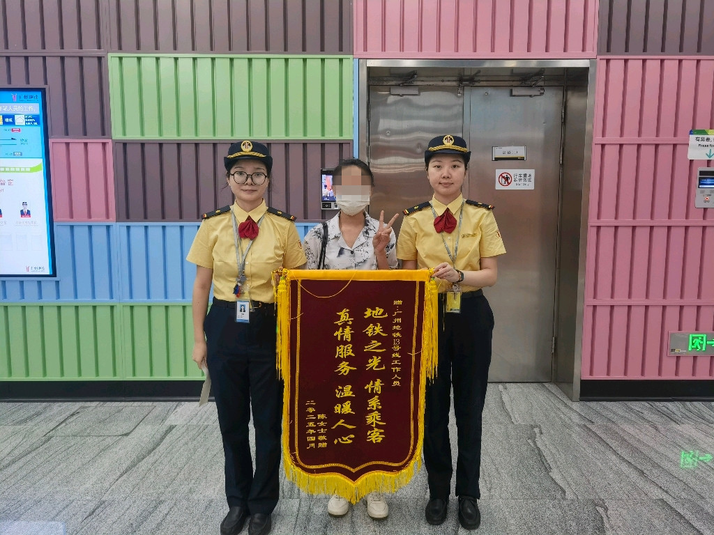 “小姐姐工作人员一直在我身后扶着我,她戴着口罩,也看不清她的脸,但我记得,当时躺在地上,我抓着她的手,地板是冷的,但她的手是如此的温暖……”近日,乘客陈女士在广州地铁十三号线裕丰围站因突发急性肠胃炎,疼痛难忍,体力不支,突然栽倒在地上,幸得车站工作人员、热心乘客及时救助并报120送医,最终有惊无险。4月19日,身体恢复的陈女士特地返回车站送上一面印着“地铁之光、情系乘客,真情服务、温暖人心”的锦旗和一封手写感谢信,感谢车站的暖心帮助。