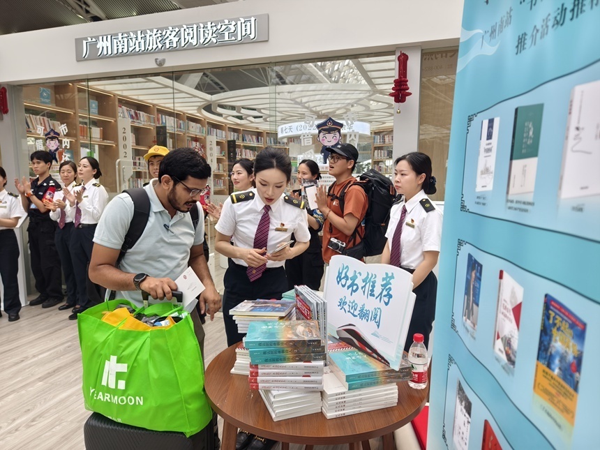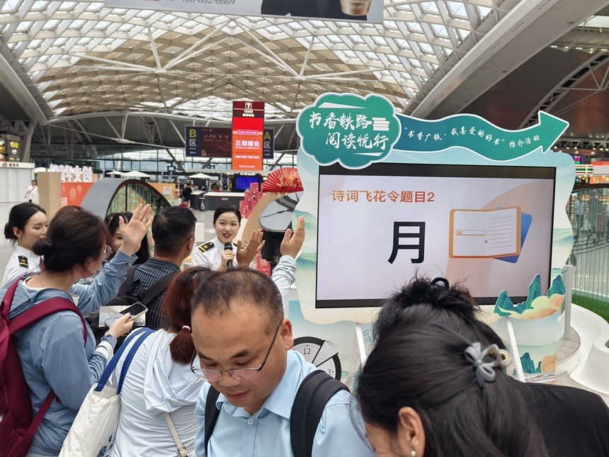 为丰富好书分享活动的趣味性,增强与旅客之间的互动,广州南站还设置了“读书名言填空”“诗词飞花令”“猜书名小能手”3场游戏互动环节,每场游戏均设置10个题目,共有30名幸运旅客获得车站赠送的书籍、书签以及铁路明信片,将活动氛围推向高潮。