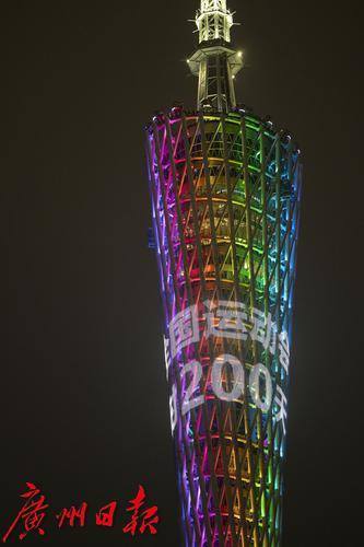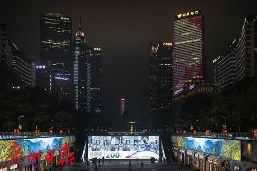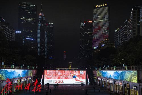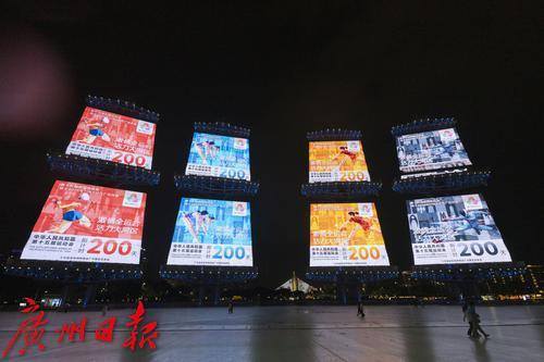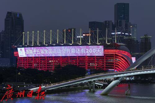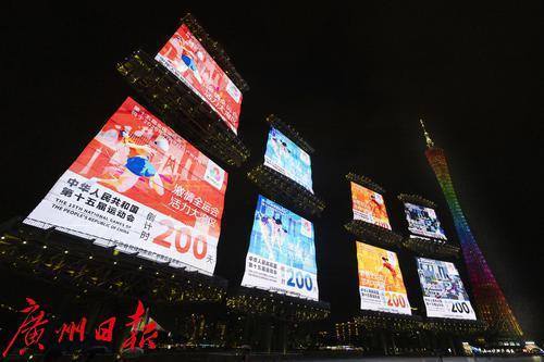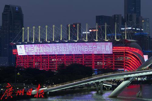 2025年4月23日晚,广州塔、花城广场LED屏和海心沙灯网、海心沙帆屏轮播“第十五届全国运动会将于2025年11月9日在广州开幕”“第十五届全国运动会开幕倒计时 200天”宣传标语。