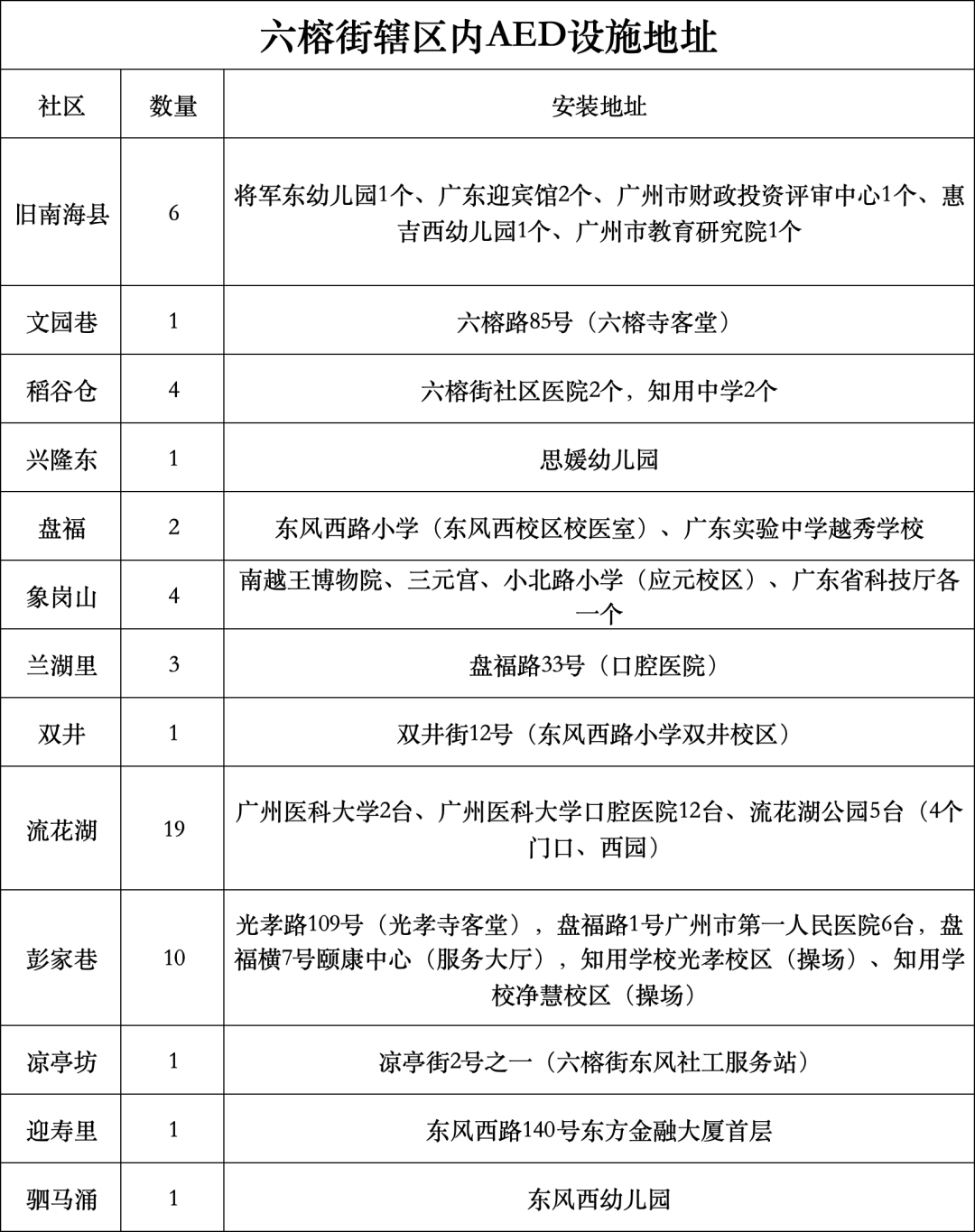 此外,为筑牢生命健康防线,六榕街绘制辖区内AED设施地图指引,并通过线上、线下广泛发布,让广大干部职工及居民群众相知相会。未来,六榕街将建立急救技能常态化培训机制,持续扩大“人人会急救、急救为人人”的社会效益。
