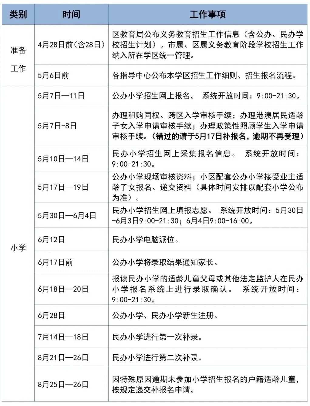 (六)7月14日-7月18日、8月21日-8月26日,民办小学进行补录。
