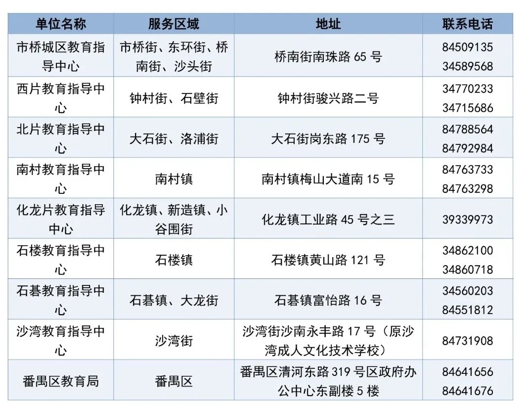 番禺区教育局及各教育指导中心联系方式