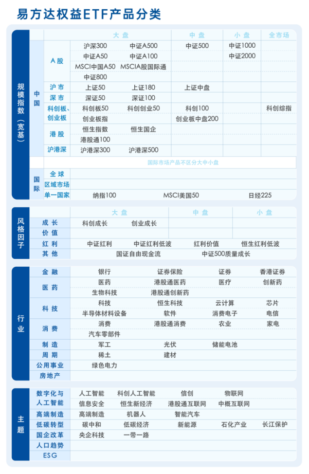 在前期率先大批量调整ETF简称之后,近日,易方达基金结合本土实践与国际标准,将股票指数ETF进行系统梳理,分为规模指数(宽基)、风格因子指数、行业指数、主题指数四大类,方便投资者了解不同ETF的实际特征,找到适配自身需求的产品;同时在梳理时与国际惯例相对一致,便于境外投资者更好地了解中国ETF、投资中国。
