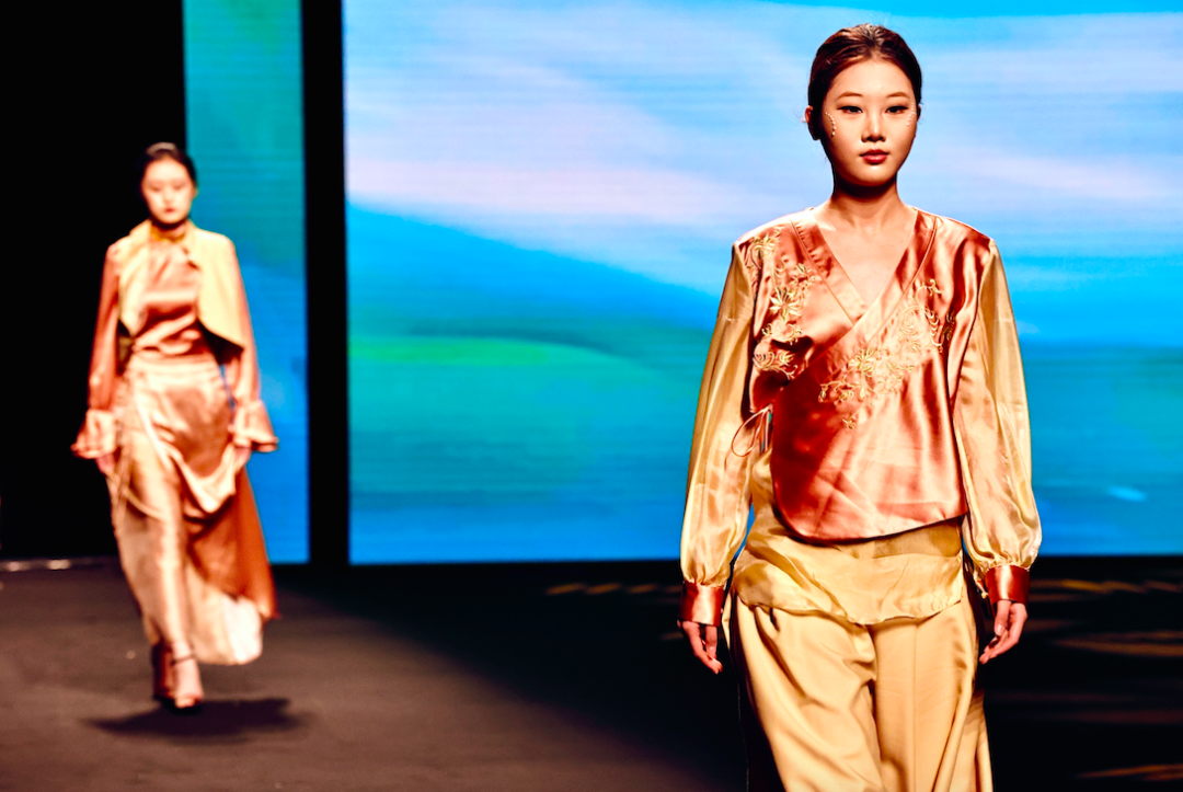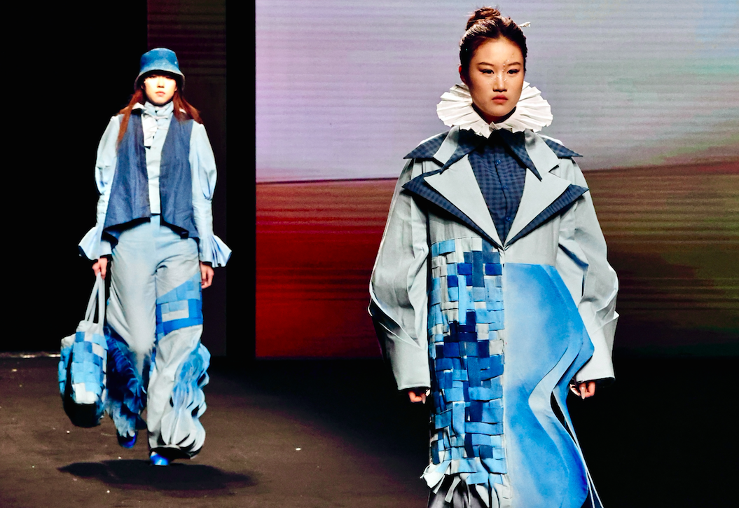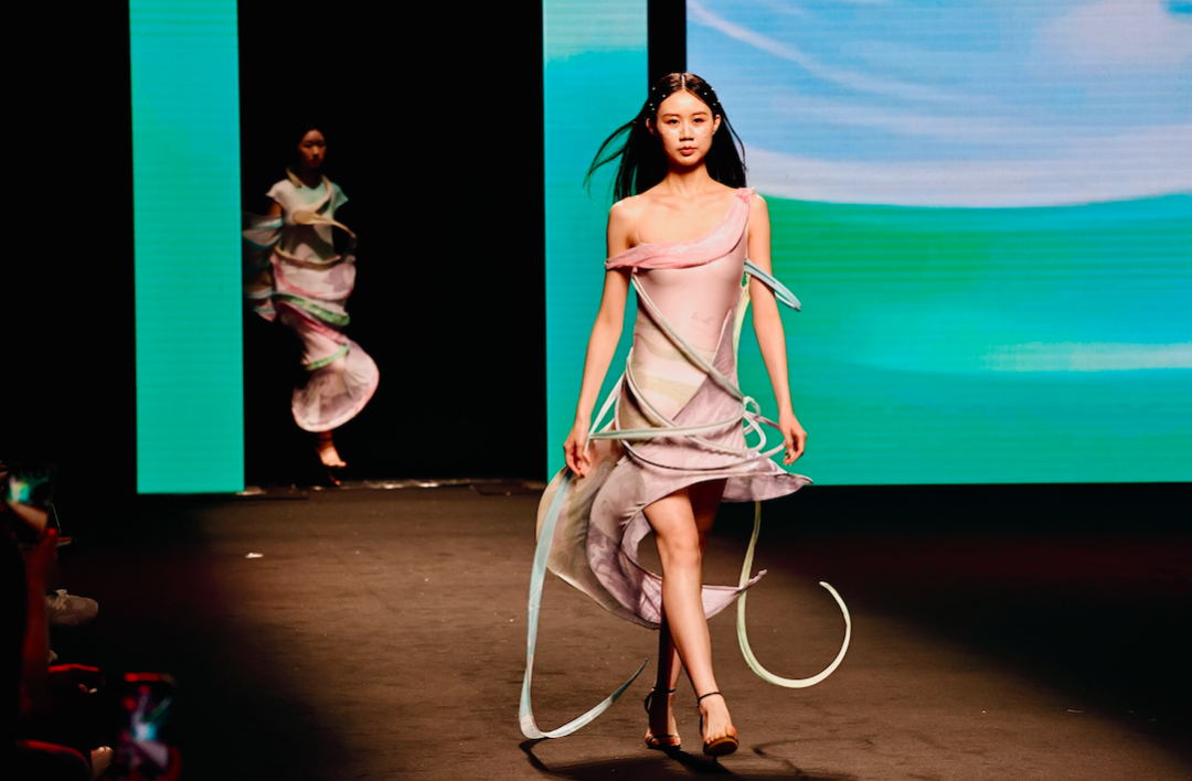 时装周首场展演,华南农业大学服装系与表演系2025届毕业生带来主题为“衣启新程”的毕业作品秀,围绕“服饰文化传承和生态可持续设计”的专业亮点展开,共呈现31个系列90余套作品,通过多元的创作手法,将非遗元素、环保理念融入现代设计语言,打破传统服装的廓形与体积限制,在多元文化碰撞中实现美学价值的升华。