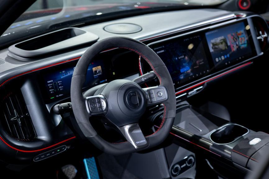 内饰方面,全新#5 BRABUS超能版采用带有发光BRABUS字样的Alcantara材质方向盘,以及AMG御用的Dinamica材质座椅。同时,新车配备迈巴赫同款超感无框电吸门和超纤绒顶棚,以及全球首搭的森海塞尔典范音响系统,提升了#5 BRABUS超能版的豪华氛围。此外,还有梅赛德斯-奔驰全球设计团队量身打造的256色氛围灯,支持音乐律动、开门氛围灯警示、温度调节联动、驾驶模式联动等多种模式,为全新#5 BRABUS超能版增添了更多个性化的潮流色彩。