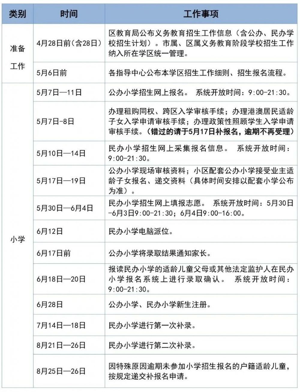 申请入读公办小学:5月7日-5月11日,具有广州市户籍的适龄儿童登录“广州市义务教育学校招生报名系统”,进入“公办小学报名”端口网上报名,并根据报名系统提示预约现场审核资料。系统开放时间:9:00-21:30。5月7日-5月8日,租购同权学生、跨区入学学生、广州市政策性照顾学生及港澳居民适龄子女向居住地教育指导中心申请入读小学一年级(错过正常报名的请于5月17日补报名,逾期不再受理)。5月17日-5月19日,具有广州市户籍的适龄儿童按预约时间携带相关证明材料到预约学校参加现场资料审核。小区配套公办小学接受业主适龄子女现场报名(具体以配套小学公布的招生方案为准)。适龄儿童父母需提前打印夫妻名下不动产查册证明,通过手机现场查册并给审核人员查验。6月28日,公办小学注册。