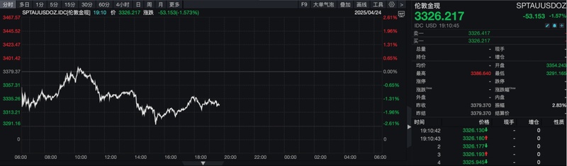 截至发稿,现货黄金报3326.22美元/盎司,跌1.57%;COMEX黄金期货报3342.25美元/盎司,跌2.25%。