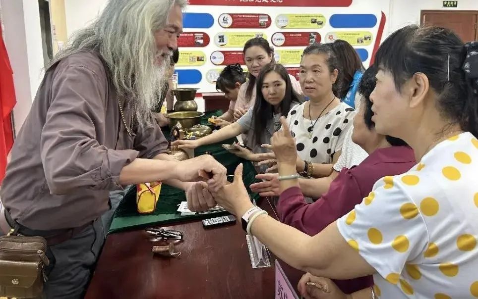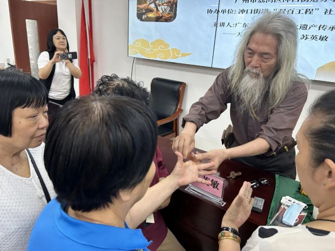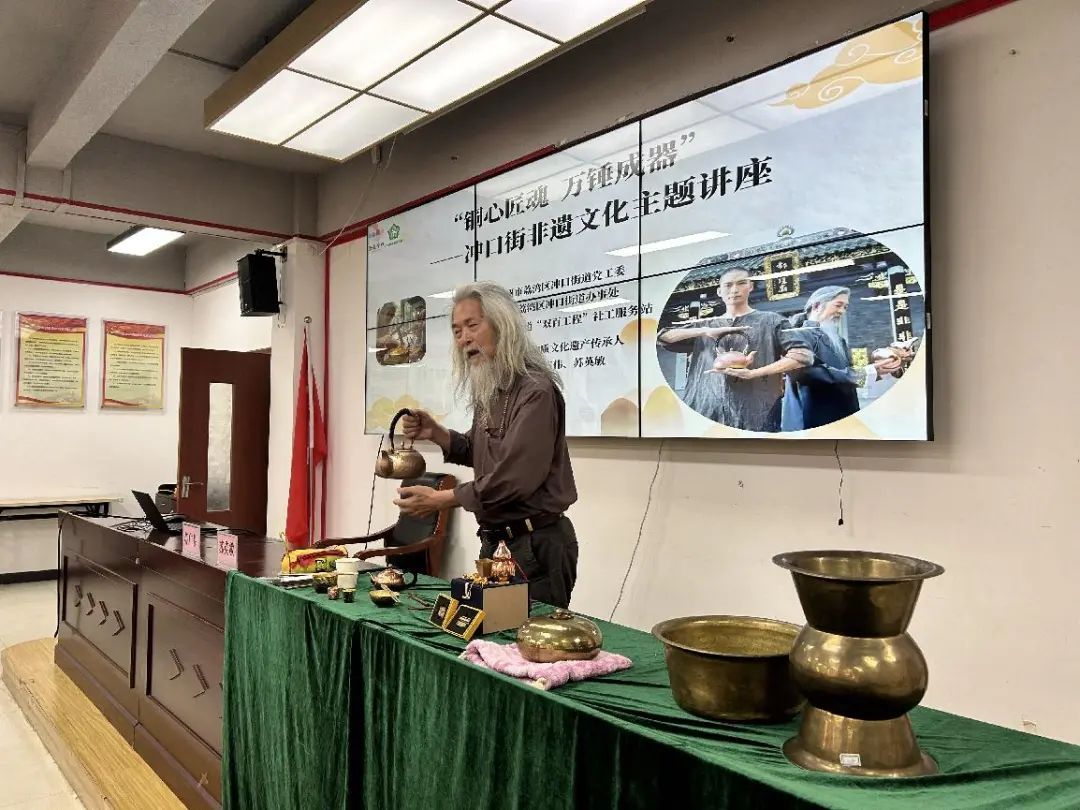 近日,广州市荔湾区冲口街迎来了一场别开生面的文化活动。广东省非物质文化遗产西关打铜技艺的代表性传承人苏广伟及其儿子、同样身为该技艺传承人的苏英敏受邀来到冲口街社工站,为当地居民和铜艺爱好者带来了一场精彩的铜艺介绍和现场打铜演示。