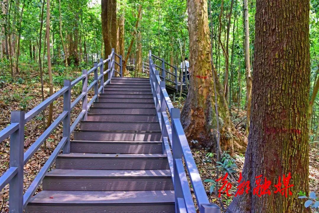 进入红锥园区,沿着依山而建的林间栈道拾级而上,眼前山花烂漫,耳畔鸟语啁啾,一切显得静谧而恬美,看着四周粗壮高大的红锥树,闻着山野草木特有的芬芳气息,一路行进,让人心旷神怡,惬意满怀。