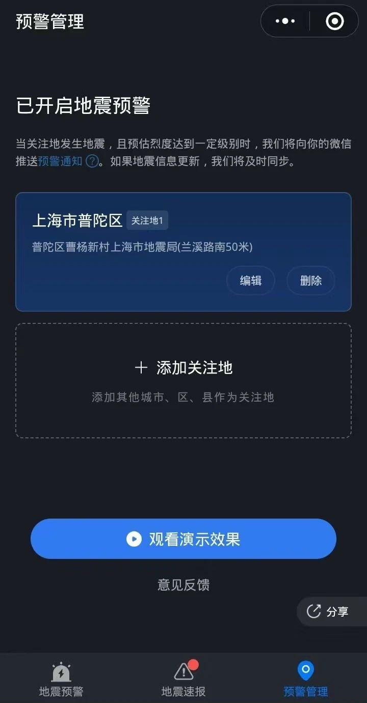 4、看到如下界面,成功开启地震预警。
