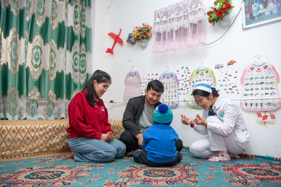 “你好!我过来看一下小宝贝,现在恢复得怎样啦?”3月26日,第八批援疆干部、广州市红十字会医院步军副院长,邵跃斌主任、陈瀚熙主任,广州援疆医护干部温雪满等来到疏附县人民医院,此时距离图图去广州市红十字会医院接受治疗已经过去了1个多月。“从广州回来以后,孩子的一切都在向好发展,能坐会站,一次能走几步路,开口说话也有了很大进步。”图图的爸爸买买提表示。