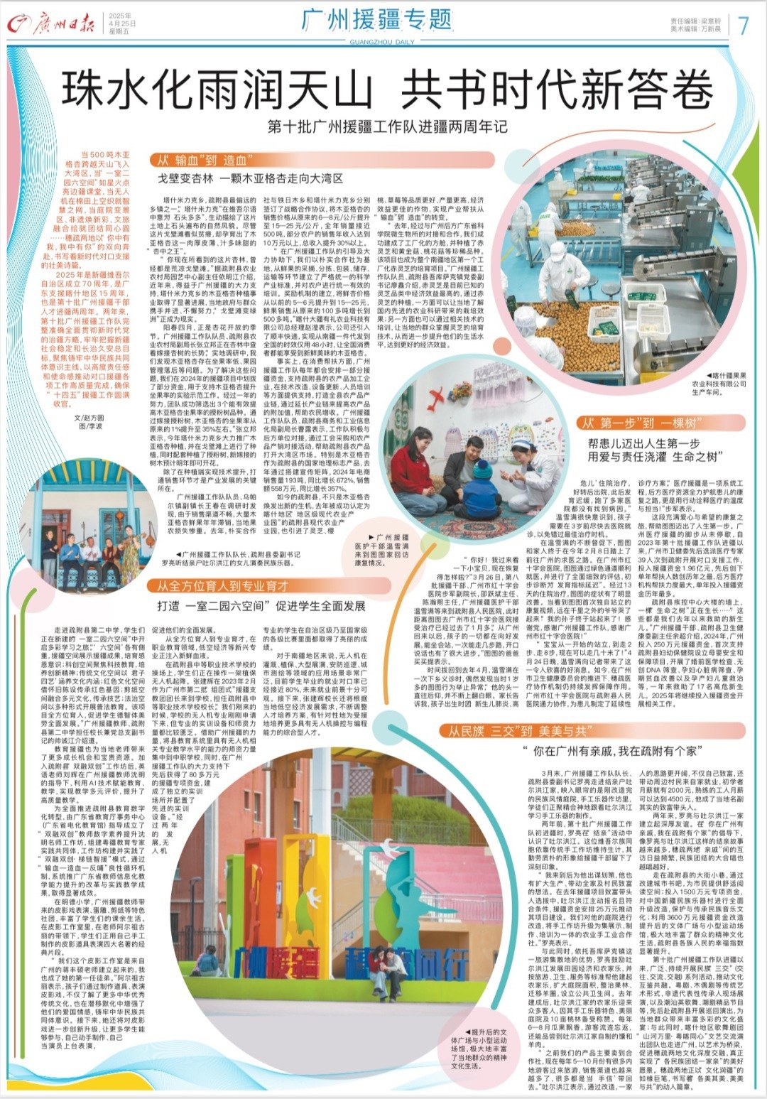 2025年是新疆维吾尔自治区成立70周年,是广东支援喀什地区15周年,也是第十批广州援疆干部人才进疆两周年。两年来,第十批广州援疆工作队完整准确全面贯彻新时代党的治疆方略,牢牢把握新疆社会稳定和长治久安总目标,聚焦铸牢中华民族共同体意识主线,以高度责任感和使命感推动对口援疆各项工作高质量完成,确保“十四五”援疆工作圆满收官。