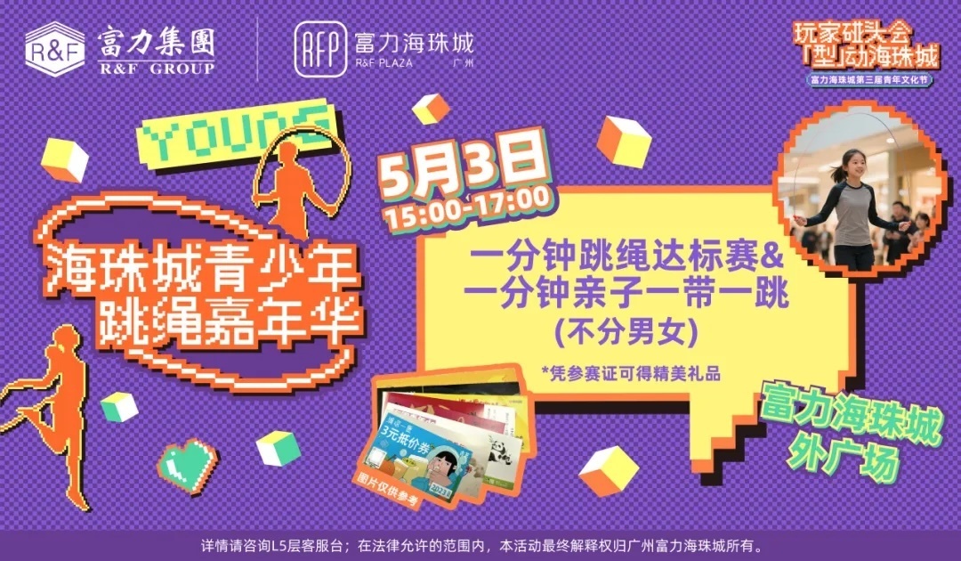 5月3日15:00-17:00,富力海珠城将在富力外广场举办青少年跳绳嘉年华(跳绳比赛),活动将进行1分钟跳绳挑战赛,通过海珠城小程序报名。参赛即赠商家优惠券礼包。欢迎6-15岁青少年参与,穿着运动装准时到场。