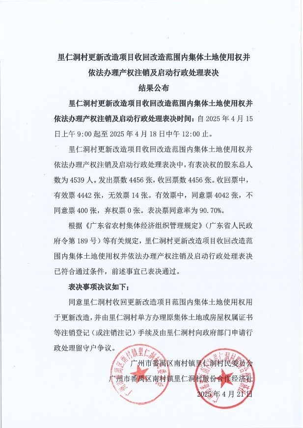 4月25日,记者从越秀地产获悉,里仁洞村更新改造项目收回改造范围内集体土地使用权并依法办理产权注销及启动行政处理表决圆满结束,表决高票通过。