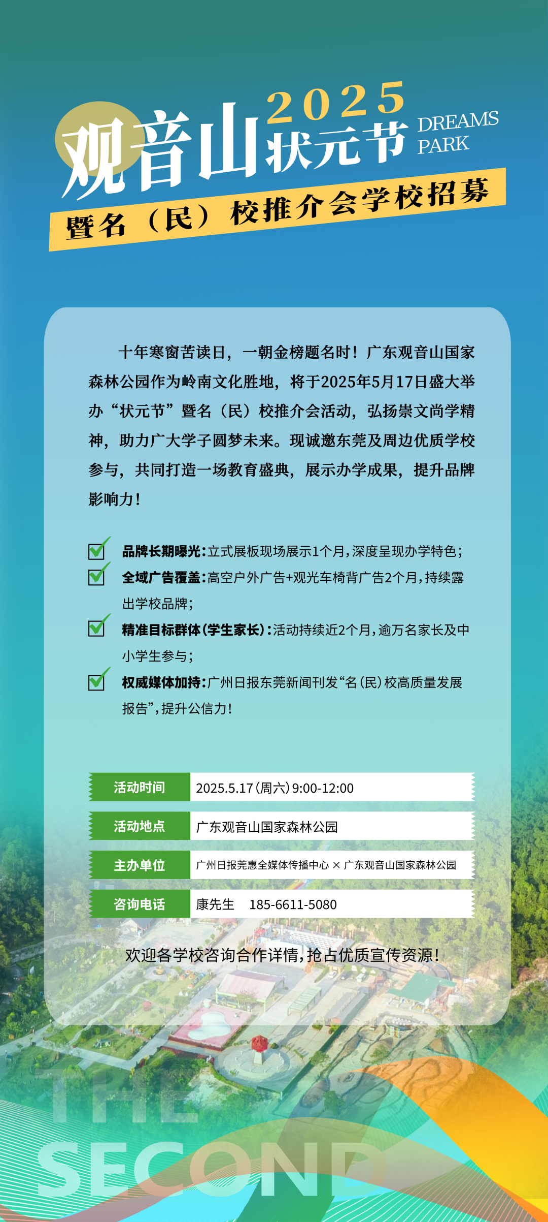 广东观音山状元文化节暨第二届东莞名(民)校推介会将于5月17日开幕,带来精彩纷呈的古风巡游、名校资讯,可谓好玩又有用。活动由广州日报莞惠全媒体中心、广东观音山国家森林公园联合主办。