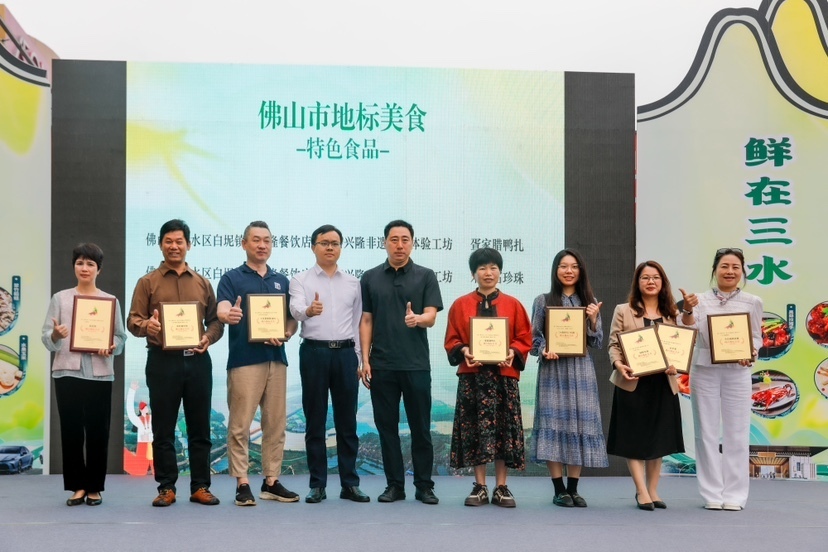 在佛山市地标美食名菜名宴授牌环节,今日城酒楼的今日城荷花宴、伍福小厨的全牛宴等荣获“佛山市地标美食名宴”称号;李庄主农庄的三水黑皮冬瓜·冬瓜艇、咏泉酒家的金牌吊烧鸡和风味腊乳鸽皇、金爪皇华兴餐厅的官家豉油鸡、伍福小厨的秘制牛蹄等获评“佛山市地标美食名菜”称号;疍家腊鸭扎、禾秆冚珍珠和臭屁醋等获评“佛山市地标美食特色食品”称号。