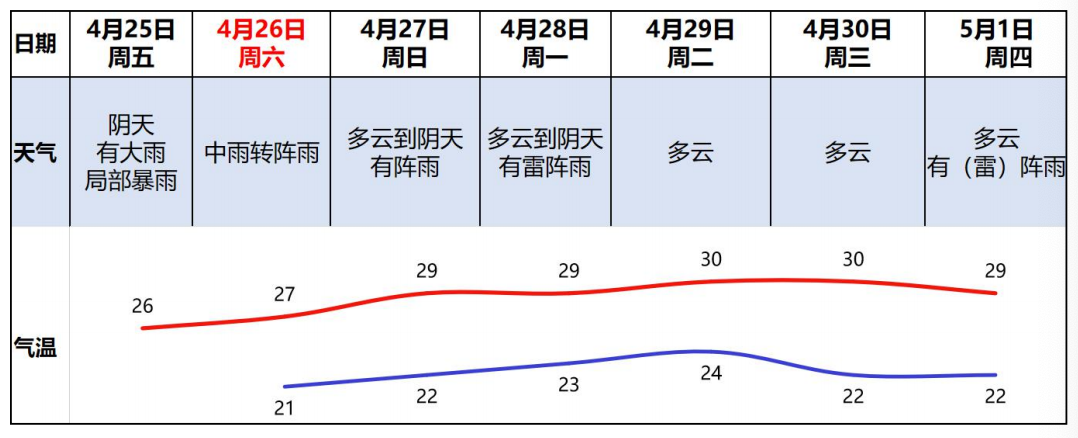 4月25日,市防汛防旱防风总指挥部办公室与市气象局、省水文局广州水文分局对我市的气象水文情况进行了会商。会商结论意见指出,预计,26日起广州降雨减弱。25日,阴天,有大雨、局部暴雨,伴有强对流天气;26日,南部区域中到大雨转阵雨,中北部区域阴到多云有阵雨;27日至28日,多云到阴天,有(雷)阵雨;29日至30日,多云为主;5月1日至3日,多云,有(雷)阵雨。