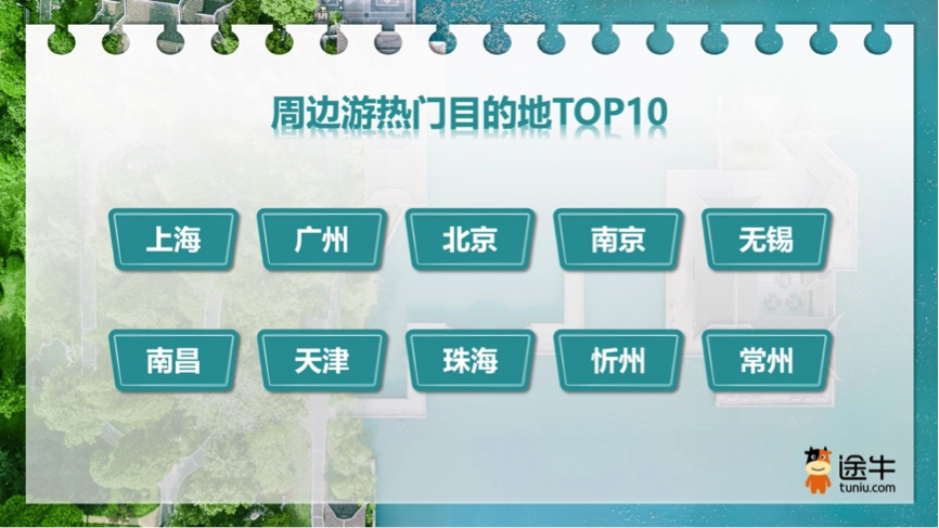周边游在本周迎来了预订高峰。周边游热门目的地方面,上海、广州、北京、南京、无锡、南昌、天津、珠海、忻州、常州等地吸引了更多本地及周边城市游客的目光。4月25日,本地多家度假酒店的相关人士向记者透露,预订量正稳步上升。同时,文博场馆、古镇古村、历史遗迹、主题乐园等兼具文化体验与亲子休闲的项目也是大家关注的焦点,包含相关行程的打包旅游产品预订量持续攀升。截至目前“五一”假期出游预订用户中,亲子游出游人次占比接近40%。其中,上海、北京、三亚、广州、南京、重庆、西安、珠海、青岛、厦门等目的地是亲子游的热门选择。