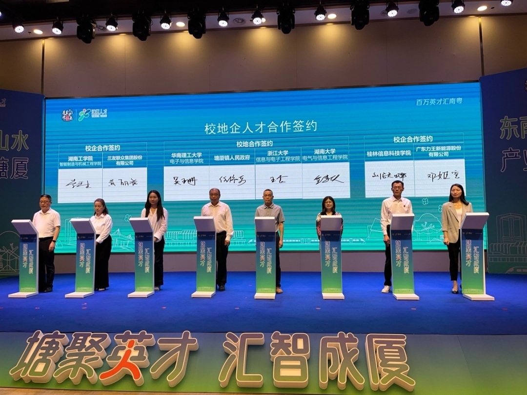 当天,人才服务大使聘用仪式、校园大使聘用仪式、人才引进聘用仪式、校地企人才合作签约仪式同步举行。塘厦镇政府与浙江大学、华南理工大学、湖南大学签订校地合作协议,湖南工学院与三友联众集团股份有限公司、桂林信息科技学院与广东力王新能源股份有限公司分别签订校企合作协议。