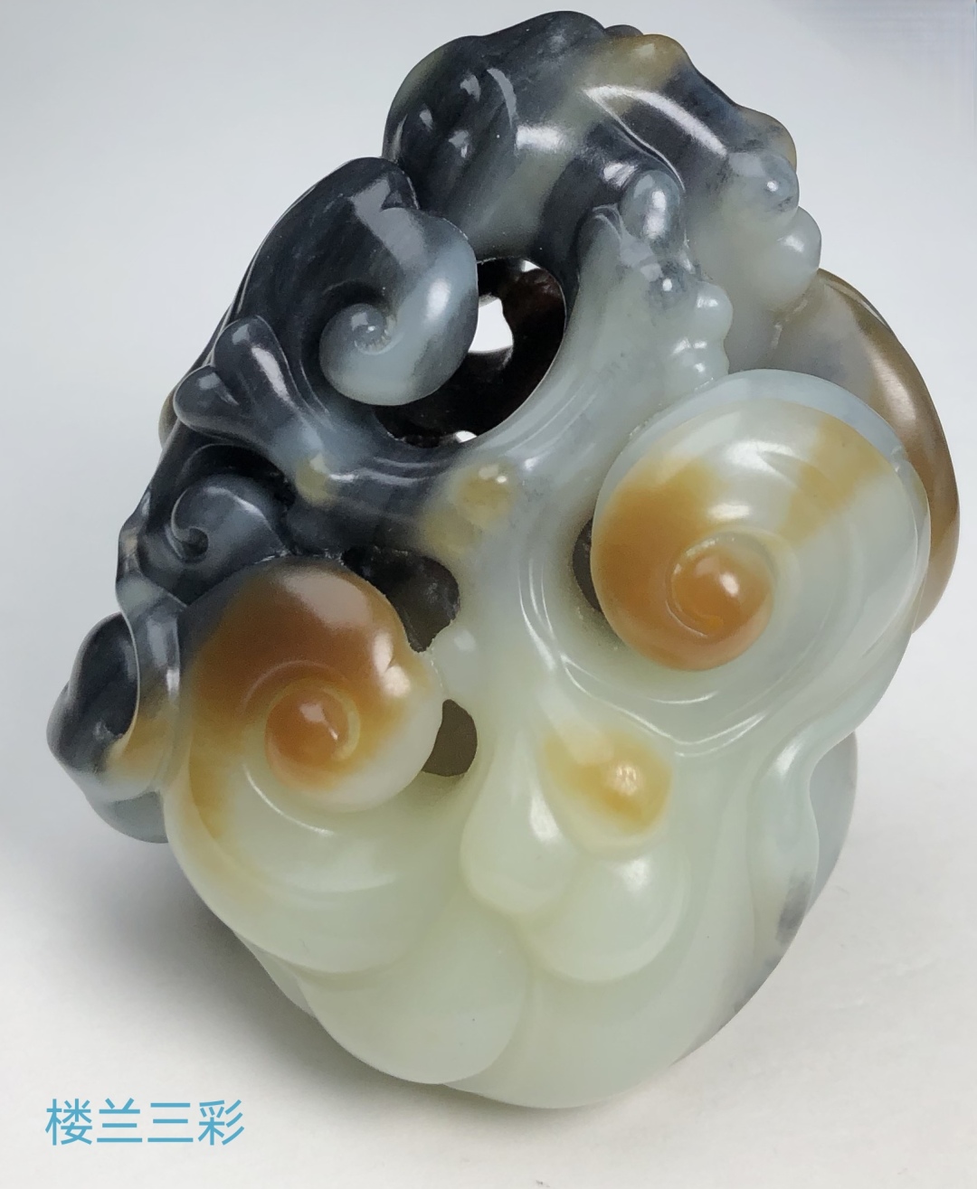 "楼兰三彩"是和田玉中的珍稀品种,其独特的墨、白、糖三色共生,形成别具一格的糖青花料,给人以神秘的美感体验。这种玉石因其稀有性和艺术价值,备受收藏界关注。