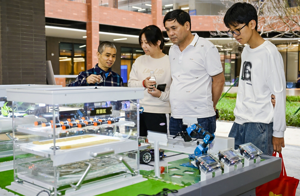 明德楼展区内,机器狗灵动起舞、AI篮球精准投筐、下棋机器人“以一敌十”……几十项AI项目互动体验吸引众多学生驻足,引来阵阵惊叹。西安电子科技大学广州研究院滕祥意副教授带领的博士团队,在科技馆现场演示人工智能实验,展现科研与教育的深度融合。
