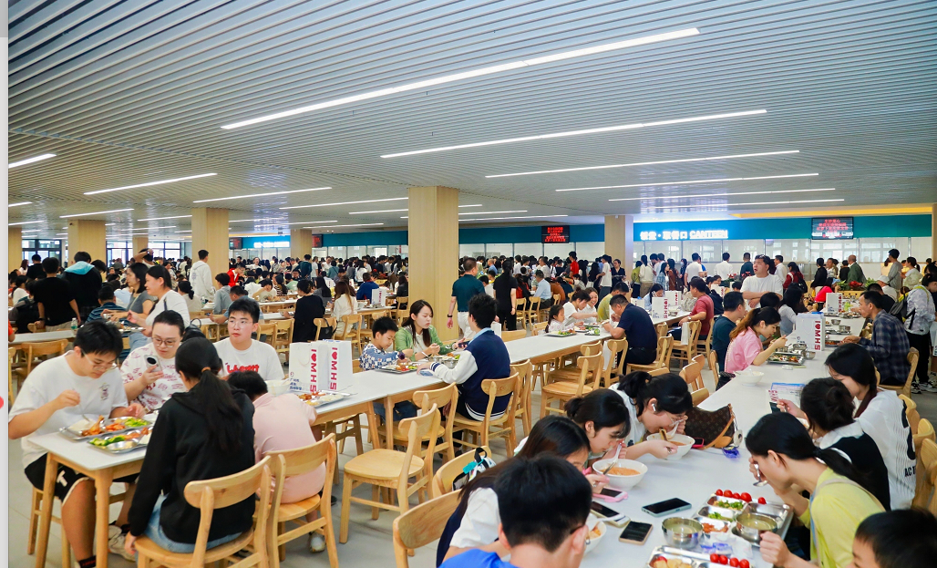 家长学生们正在食堂体验健康美味的校园餐。